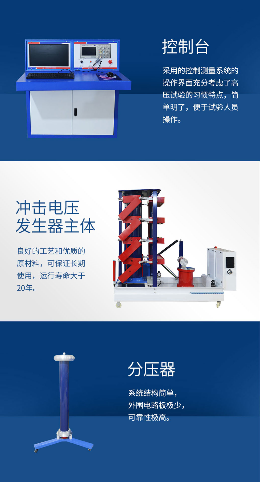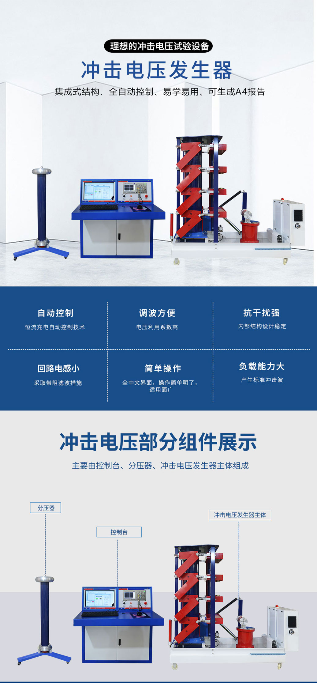 主要用于電力設(shè)備等試品進(jìn)行雷電沖擊電壓全波、雷電沖擊電壓截波和操作沖擊電壓波的沖擊電壓試驗(yàn),檢驗(yàn)絕緣性能。