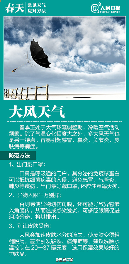 如何應對初春多變天氣作者:合眾電氣發布時間:2016-03-23瀏覽量:11029 次字體顯示:【大】【中】【小】 春季天氣調皮,昨天還日光融融閑賞花,今日就寒風瑟瑟緊添衣!大風、沙塵、陰雨等交替上演,讓感冒、過敏、關節炎等進入高發期。今天#世界氣象日#,四張圖教你應對春季多變天氣! 上一篇: HZXC-104D變壓器智能控制箱最新發貨現場下一篇: 面對問題疫苗,我們怎么辦?