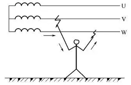 兩相觸電是指人體同時接觸設備或線路中的兩相導體而發(fā)生的觸電現象。若人體觸及一相火線、一相零線,人體承受的電壓為220V;若人體觸及兩根火線,則人體承受的電壓為線電壓380V。兩相觸電對人體的危害更大。