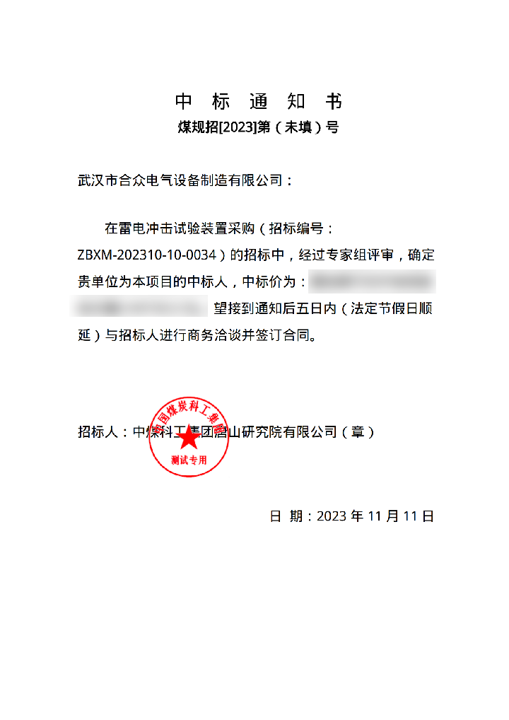 在雷電沖擊試驗裝置采購( 招標(biāo)編號:ZBXM-202310-10-0034 ) 的招標(biāo)中,經(jīng)過專家組評審,確定貴單位為本項目的中標(biāo)人。望接到通知后五日內(nèi)(法定節(jié)假日順延)與招標(biāo)人進(jìn)行商務(wù)洽談并簽訂合同。