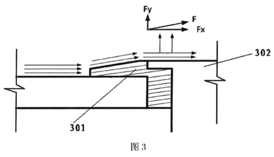 通過液體介質流過由保護套301形成的坡面進行導流,可以產生一個與坡面平行的力F,這個力可以分解為水平方向的力Fx和垂直方向的力Fy,與液體介質的流向垂直的力Fy可以減少電極頭302表面所承受的壓力,從而減少電極頭的磨損。坡面的傾斜角越大,垂直向上的力Fy也越大。但是,應該注意,坡面的傾斜角不能設置的過大,以免產生擾流,即,坡面的傾斜角的設置不要對液體介質的流速產生影響。通常,為了確保坡面的傾斜角度,保護套的頂部不高于電極頭的頂部。