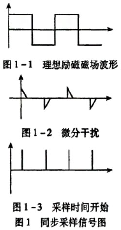 在現(xiàn)行的電磁流量計設(shè)計中,低頻矩形波勵磁結(jié)合了直流勵磁和交流勵磁的優(yōu)點,成為主要勵磁方式之一。在低頻勵磁方式下其干擾主要表現(xiàn)為:由勵磁電流突變產(chǎn)生的微分干擾信號。理想勵磁磁場信號如圖1-1所示,為低頻矩形波,實際上隨著勵磁電流變化(dI/dt)磁場上產(chǎn)生微分干擾信號,如圖1-2,可以看到隨著電流的穩(wěn)定,干擾信號隨之消失,因此同步采樣技術(shù)可以有效抑止微分干擾信號。實際設(shè)計中模數(shù)轉(zhuǎn)化器使用AD公司的24位sigma delta模數(shù)轉(zhuǎn)化器AD7714。AD7714可以分別采用硬件和軟件方式進行采樣開始時間控制從而實現(xiàn)同步采樣。采用軟件方式時,當(dāng)控制寄存器中FSYNC位為邏輯1時,模數(shù)轉(zhuǎn)換器處于復(fù)位狀態(tài);向該位寫邏輯0時,器件開始采樣輸入信號。在應(yīng)用中,低頻勵磁信號由MSP430單片機內(nèi)部定時器產(chǎn)生,同時產(chǎn)生采樣信號。如圖1所示,采樣開始時間滯后勵磁信號1/4個周期。