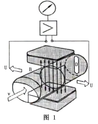 如圖1所示,在一內(nèi)徑為D,內(nèi)部磁場強度為B的非導磁性測量管內(nèi),液態(tài)的具有導電性被測介質(zhì)以v的速度流動,則在與流動方向垂直的方向上產(chǎn)生與流量成比例的感應電勢U,該電勢的大小如下