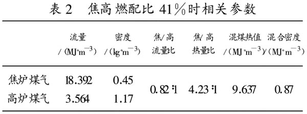 實(shí)際生產(chǎn)上采用的焦?fàn)t、高爐煤氣的配比為百分之四十一左右,有時(shí)甚至更低。現(xiàn)以配比為百分之四十一為例,相關(guān)參數(shù)如表2。