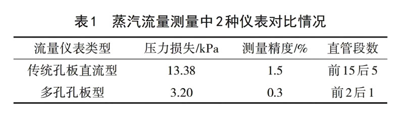 例如,在某聚丙烯生產(chǎn)項(xiàng)目中,需要對丙烯脫氣塔再沸器中的蒸汽進(jìn)行流量測量。具體測量中,該企業(yè)ZUI初選擇的是傳統(tǒng)孔板節(jié)流形式的流量儀表,但是因?yàn)楸敬雾?xiàng)目中對于工藝精度有著非常高的控制要求,需將精度控制在1%以內(nèi),同時應(yīng)盡可能將測量過程中的壓力損失降低,且對于空間布局也具有一定的限制,在這樣的情況下,傳統(tǒng)孔板節(jié)流形式的流量儀表并不能滿足該項(xiàng)目的實(shí)際測量需求。基于此,企業(yè)便對原來的方案進(jìn)行了優(yōu)化改進(jìn),選擇用多孔孔板形式的流量儀表來替代傳統(tǒng)孔板節(jié)流形式的流量儀表。借助于相應(yīng)的軟件來進(jìn)行了流量儀表的設(shè)計(jì)計(jì)算,對傳統(tǒng)孔板節(jié)流形式的流量儀表和更換之后的多孔孔板形式流量儀表進(jìn)行了對比,蒸汽流量測量中2種儀表對比情況見表1。