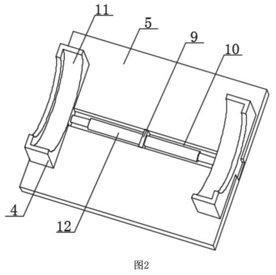 如圖1-5所示,優選的,清洗座5的頂部開設有放置槽10,放置槽10的內壁中部固定安裝有固定分隔板9,固定分隔板9的底部與放置槽10的內壁底部相貼合,固定分隔板9外壁左右兩側面固定連接有電動伸縮桿12,每個電動伸縮桿12的伸縮端固定連接有支撐板4,每個支撐板4的頂部開設有定位弧形槽11,電磁流量計本體6外壁兩端與貫穿槽8的內壁相貼合,電動伸縮桿12能夠對支撐板4的位置進行調整,進而方便支撐板4對電磁流量計本體6進行夾持,同時通過定位弧形槽11對電磁流量計本體6進行固定,方便對電磁流量計本體6進行清洗。