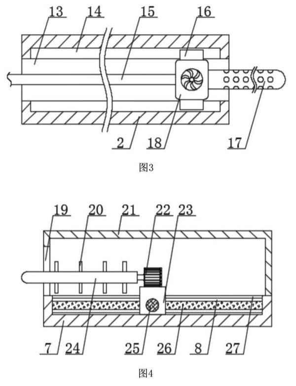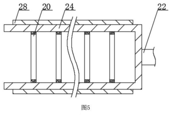 如圖1-5所示,在對電磁流量計本體6進行清洗時,通過電動伸縮桿12推動支撐板4向外移動,使電磁流量計本體6放置在定位弧形槽11上,使電動伸縮桿12對支撐板4進行收縮,從而更加快捷的對電磁流量計本體6進行固定,同時定位弧形槽1l也能對電磁流量計本體6提供支撐,使電磁流量計本體6固定后進行清洗,通過導向滑塊16方便對水泵18進行滑動,使水泵18上的多孔清洗管17能夠移動到電磁流量計本體6的內部,對電磁流量計本體6內部進行噴水,使電磁流量計本體6內部的水垢進行掉落,而彈性輸水管15能夠便于水泵18在移動后進行供水,通過用手移動推動桿25,使安裝座23進行移動,使U型清洗架24在電磁流量計本體6的內部進行來回移動,便于對電磁流量計本體6內部清洗得更加徹底,從而通過啟動驅動電機22帶動U型清洗架24進行轉動,使U型清洗架24上的清理刷28對電磁流量計本體6內部的水垢進行清洗,而穩固環20能夠避免U型清洗架24在清洗過程中出現損壞。