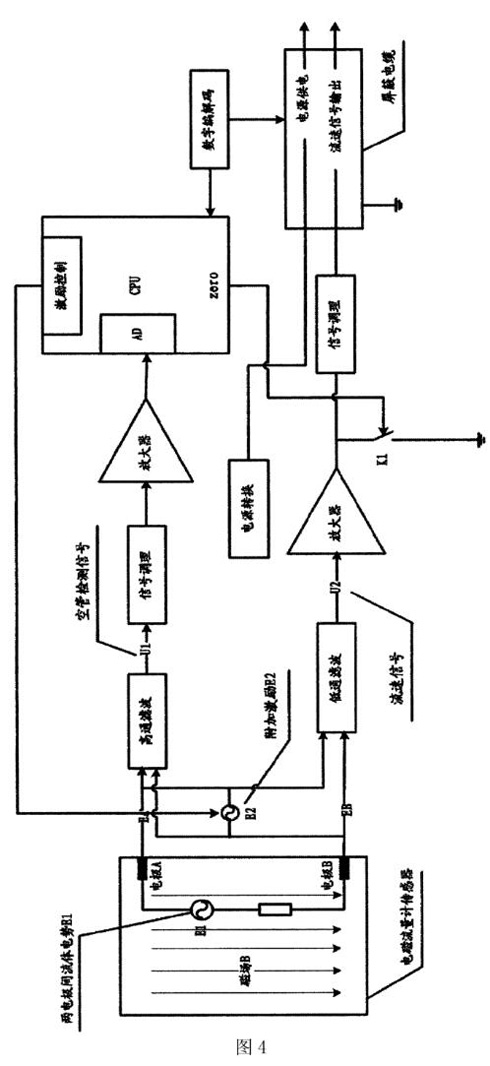 見圖1示意圖中,電磁流量計傳感器在交流勵磁下,產生交變磁場,導電流體在交變磁場中切割磁力線產生感應電勢E1,通過屏蔽電纜輸出至遠端信號轉換器的主控制電路板,在主控制電路板上輸出流速信號并顯示見圖3、圖4示意圖中,由CPU控制口產生周期為l6us的高頻激勵,經模擬轉換為高頻正弦激勵E2,該正弦激勵直接施加在,電磁流量計傳感器的其中一個電極與地或者是兩個電極之間,(圖3是一個電極與地之間施加空管檢測信號的電磁流量計的電路結構圖,圖4是兩個電極之間施加空管檢測信號的電磁流量計的電路結構圖);由此產生被測流體內阻Rl的測量信號U1,該測量信號U1與流體內阻R1成線性關系U1=K*R1(K為已知系數)。不可避免的是流體內阻測量信號與流體流速測量信號同時存在,二者混在一起,再經過高通濾波電路將空管檢測信號提取岀來,此時對流速信號衰減在60dB以上,經CPU實時采樣并經過數字濾波后,與設定的閾值(可調參數)相比較,若判斷為空管,則CPU發出zero信號,立刻閉合開關K1關閉流速測量信號,使信號轉換器顯示為零,否則斷開開關KI正常輸出流速信號。而電極上流速測量信號經過低通濾波電路,此時對空管檢測信號衰減60B以上,再經過信號調理電路后輸出流速信號,實現與空管檢測信號相互分離,從而保證流速測量的準確度。