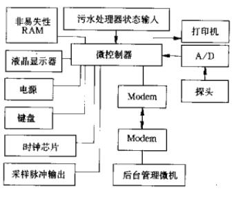 該系統(tǒng)的硬件組成如圖1所示。微控制器采用89C52;探頭選用壓力式探頭,可克服超聲波式探頭易受污水中泡沫干擾的弊病;A/D轉(zhuǎn)換器選用AD1674;時(shí)鐘芯片選用DS1302;液晶顯示器為點(diǎn)陣式的MGLS19264,可顯示四行漢字;非易失性RAM選用DS1230;打印機(jī)為普通微型打印機(jī);采樣脈沖輸岀端口用來(lái)輸出采樣脈沖,控制采樣器采樣污水;污水處理器狀態(tài)輸入端口可輸入污水處理器的通斷時(shí)間,供遠(yuǎn)程監(jiān)控作用