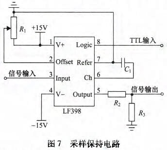 采樣保持電路實際是一種模擬信號存儲器,其開關通斷通過數字指令控制,從而完成輸入信號瞬時值的采樣及存儲。圖7所示為集成芯片LF398組成的采樣保持電路,該電路具有采樣速度快、保持下降速度慢、抗干擾能力強和不易受溫度影響等特點,其邏輯電平輸人與TI相連。當TTL為高電平時,對輸入信號進行采樣;當TIL為低電平時,對輸入信號進行保持。