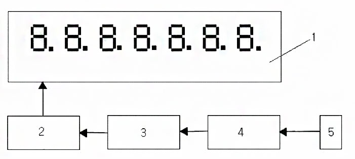 如圖1所示,本實用新型實施例所提供的一種用于電磁流量計的遠(yuǎn)距離流量顯示裝置,包括LED數(shù)碼管1和LED驅(qū)動芯片2,其特征在于:還包括單片機(jī)3、RS485通信芯片4和RS485通信連接件5