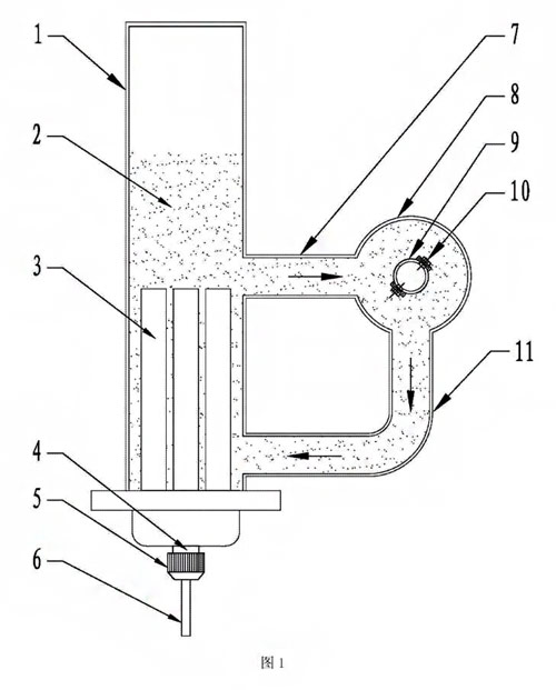 圖1為本發(fā)明電磁流量計(jì)的脫蠟裝置結(jié)構(gòu)示意圖;圖中序號(hào)說(shuō)明:1箱體、2導(dǎo)熱介質(zhì)、3PTC陶瓷加熱器、4防爆接線座、5鎖緊帽、6電纜、7*介質(zhì)通道、8吸熱器、9測(cè)量導(dǎo)管、10電極、11第二介質(zhì)通道。
