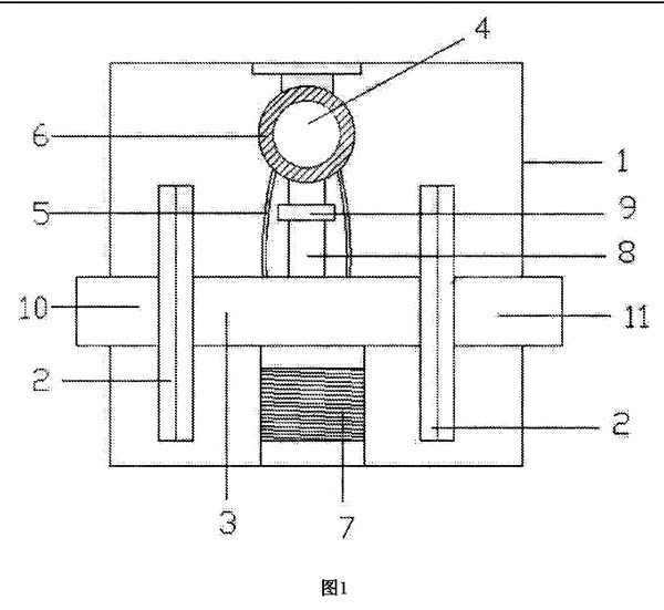 本實用新型抗震型旋進(jìn)旋渦流量計將進(jìn)氣口10和出氣ロ11分別通過連接頭2與殼売體3連接,將流量顯示器4通過旋進(jìn)螺栓9連接在連接桿8上,再將彈簧7安裝在殼體3底部,將連接桿8包裏在流量顯示器4外側(cè),以達(dá)到保護(hù)旋進(jìn)旋渦流量計的目的,箱體1作為旋進(jìn)旋渦流量計第 一道保護(hù)措施,連接桿8和彈簧7作為旋進(jìn)旋渦流量計第 二道保護(hù)措施,兩者相互配合使用共同保護(hù)旋進(jìn)旋渦流量計。