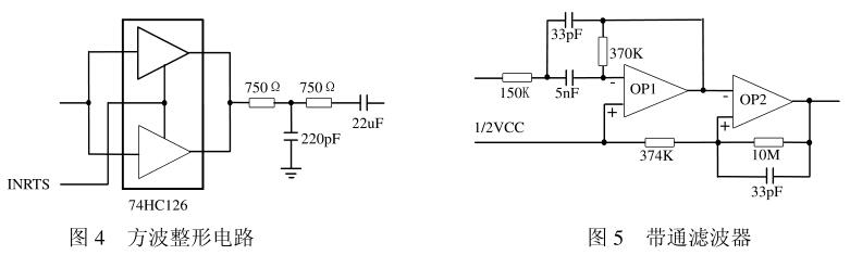 HART MODEM采用Smar公司的HT2012,它是符合Bell202通訊標準的半雙工調制解調器,實現HART協議規定的數字通訊的編碼和譯碼,采用16腳DIP和28腳PLCC封裝附屬電路主要實現信號的濾波整形,由帶通濾波器和方波整形電路組成(見圖4和圖5)。