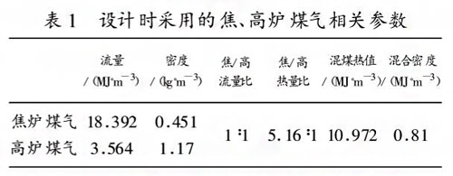 實際生產(chǎn)上采用的焦?fàn)t、高爐煤氣的配比為百分之四十一左右,有時甚至更低。現(xiàn)以配比為百分之四十ー為例,相關(guān)參數(shù)如表2