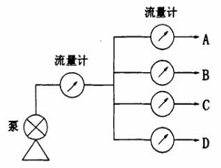 因加工不合格水煤漿的顆粒較大容易堵塞噴槍,小鍋爐大部分采用一臺“螺桿泵”加壓帶一只噴槍,用壓力或流量檢測噴槍堵塞都好解決。但大鍋爐用8~12只噴槍,如圖所示,若A槍半堵塞時,因B、C、D槍在繼續噴射,壓力變送器則檢測不到A槍是否在正常工作,在此情況下易造成爐膛燃燒點不均勻,影響鍋爐的正常工作。若A槍全堵塞,因B、C、D槍在繼續噴射,所以A槍壓力的突然變化量很小(壓力信號本身也存在上下的微小波動),DCS很難做出準確判斷,故用壓力變送器很難達到預想的效果。若用流量計檢測,流量計輸出信號送到DCS,利用其編程可以完全檢測到噴槍堵塞狀況并報警提示,以便及時清洗噴嘴。